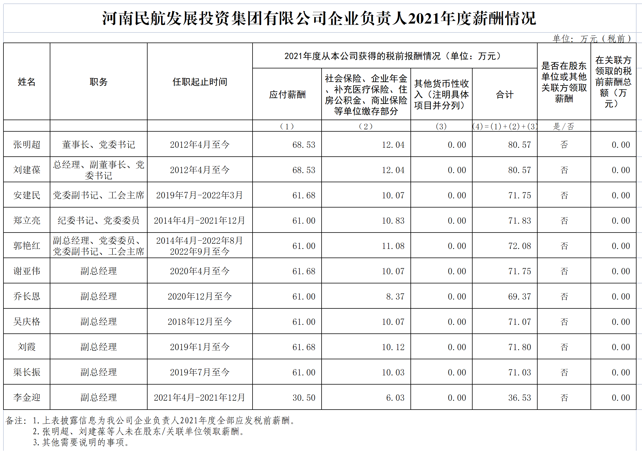 河南民航發(fā)展投資集團有限公司企業(yè)負責(zé)人2021年度薪酬情況