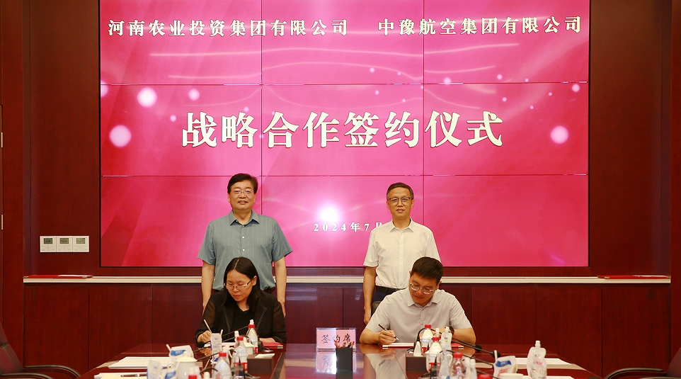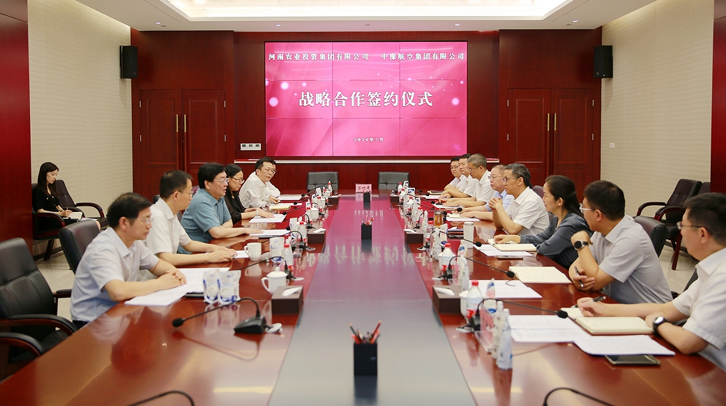 7月18日下午,中豫航空集團(tuán)與河南農(nóng)投集團(tuán)在農(nóng)投國際中心舉行工作會商,簽訂戰(zhàn)略合作協(xié)議。中豫航空集團(tuán)黨委書記、董事長張明超;河南農(nóng)投集團(tuán)黨委書記、董事長李曉寰,總經(jīng)理、副董事長張淑杰參加會談并見證雙方簽約。中豫航空集團(tuán)副總經(jīng)理劉霞,河南農(nóng)投集團(tuán)副總經(jīng)理張峰代表雙方簽署戰(zhàn)略合作協(xié)議。雙方相關(guān)業(yè)務(wù)負(fù)責(zé)人參加。