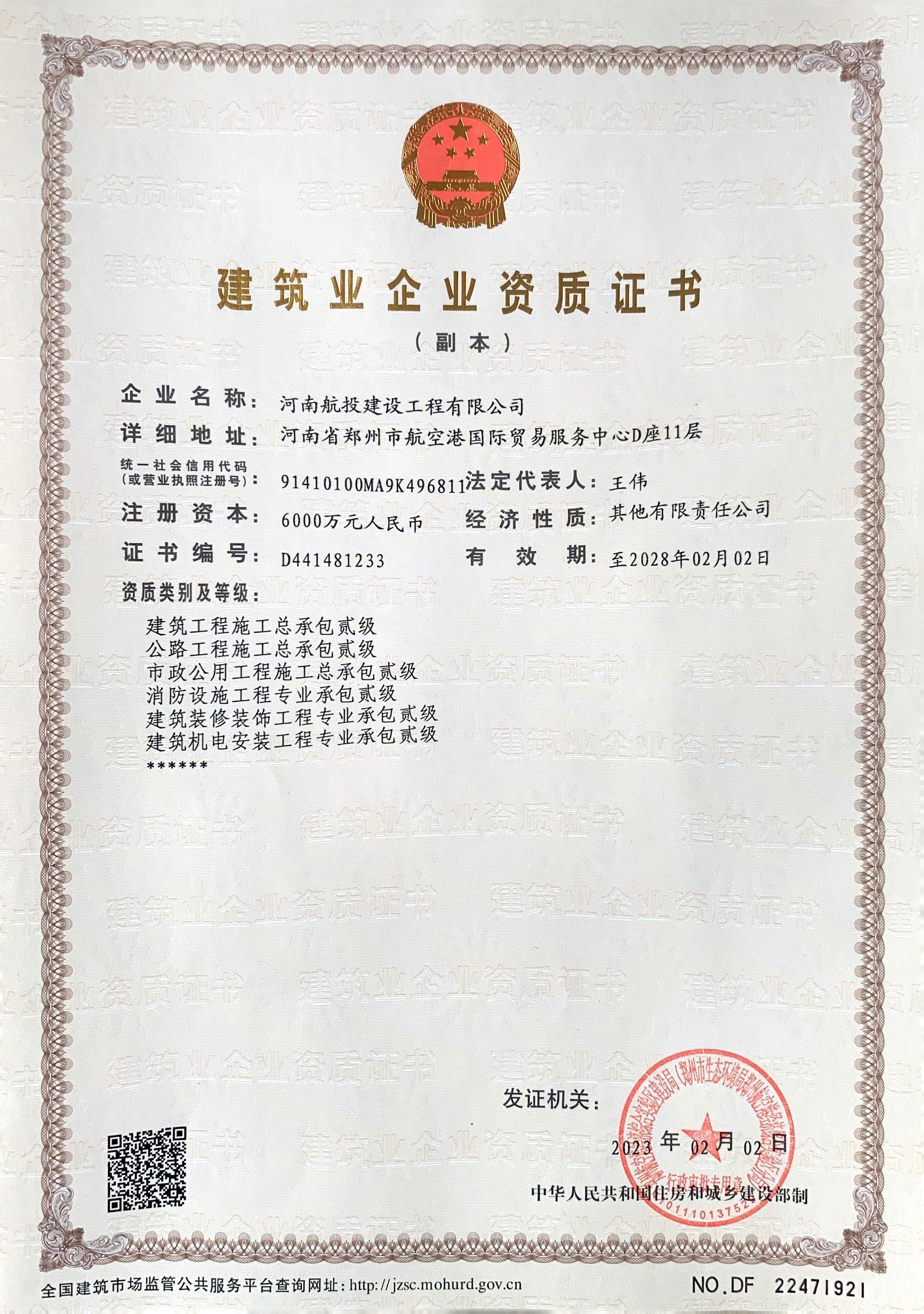 航投建工由河南航投集團(tuán)旗下河南航投航空基礎(chǔ)產(chǎn)業(yè)發(fā)展有限公司與貴州省場道工程有限公司共同出資成立。2022年9月28日,航投建工成功取得機(jī)場場道工程專業(yè)承包二級(jí)資質(zhì);同年12月8日通過河南省住建廳各項(xiàng)審核,取得《建筑施工企業(yè)安全生產(chǎn)許可證》,完成參與市場競爭的全部前置條件;12月23日,被評(píng)為鄭州航空港經(jīng)濟(jì)綜合實(shí)驗(yàn)區(qū)建筑業(yè)重點(diǎn)培育企業(yè),為施工總承包及多項(xiàng)專業(yè)資質(zhì)的取得打下堅(jiān)實(shí)基礎(chǔ)。
