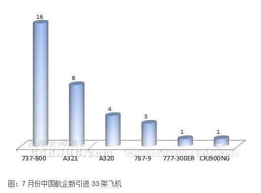 根據(jù)民航數(shù)據(jù)分析系統(tǒng)CADAS,2016年7月份中國(guó)大陸航空公司新引進(jìn)飛機(jī)33架。其中南航引進(jìn)飛機(jī)數(shù)量最多,為6架;機(jī)型方面,737-800飛機(jī)數(shù)量最多,為16架。