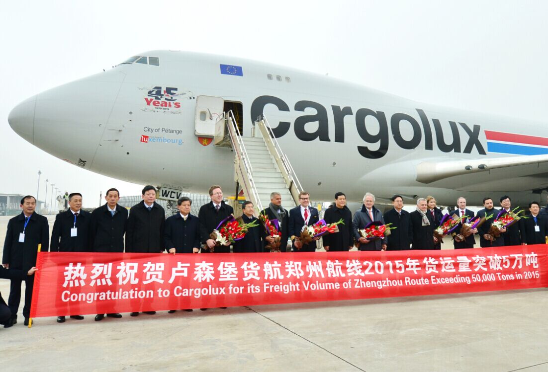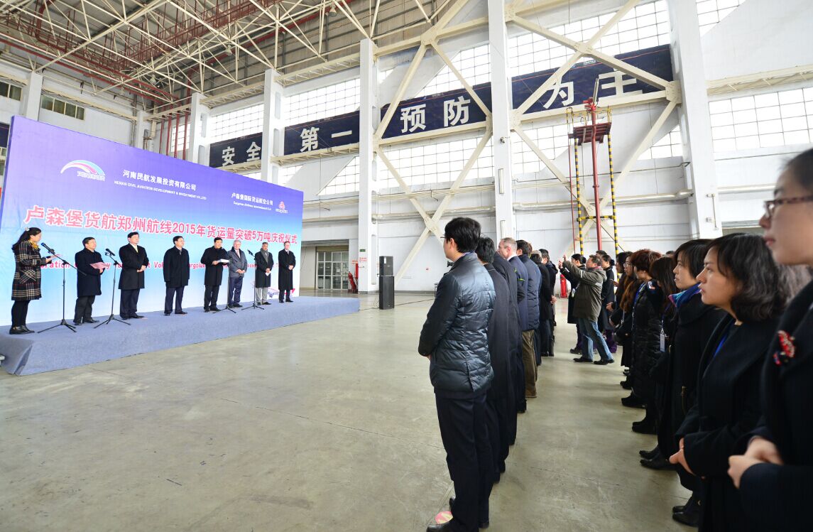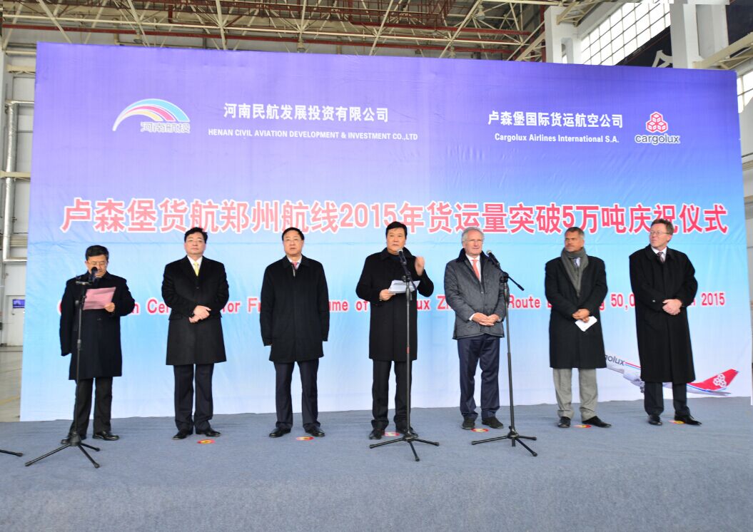 當(dāng)天中午,河南民航發(fā)展投資有限公司與盧貨航聯(lián)合在鄭州機(jī)場(chǎng)舉行了簡(jiǎn)短熱烈的慶祝儀式。河南省副省長(zhǎng)趙建才出席儀式并致辭,盧森堡駐華大使石泰嵋宣讀盧森堡可持續(xù)發(fā)展與基礎(chǔ)產(chǎn)業(yè)部部長(zhǎng)弗朗索瓦?鮑施的賀信,省政府副秘書長(zhǎng)張雷明主持儀式。省直單位有關(guān)負(fù)責(zé)人親臨現(xiàn)場(chǎng)。河南航投董事長(zhǎng)、黨委書記張明超,總經(jīng)理、副董事長(zhǎng)、黨委副書記劉建葆,公司領(lǐng)導(dǎo)悅國(guó)勇、鄭立亮、郭艷紅以及盧貨航董事會(huì)主席保羅?海明格、盧貨航總裁兼CEO德克?李奇同時(shí)參加儀式。