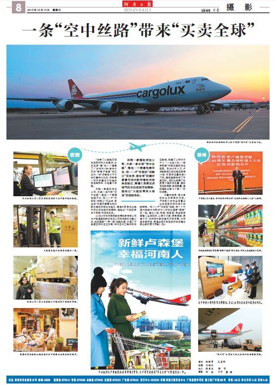 在8次報道中,既有會前的“熱身”宣傳,又有會中的集中點擊,還有會后的回顧追蹤,形成系列,精彩紛呈。13日,《河南日報》以圖文并茂的整版篇幅,對河南航投與盧貨航的合作,尤其是“新鮮盧森堡”雙向跨境E貿易進行了詳細報道。整個報道以新聞攝影為主,既有盧貨航“鄭州號”波音747-8F全貨機,也有鄭-盧航線的專業(yè)操作流程展示,還有河南百姓采購“新鮮盧森堡”商品的真實場景……以鄭盧“雙樞紐”為典型案例,圍繞“一條‘空中絲路’帶來‘買賣全球’”這一主題,生動展現了河南省依靠藍天對外開放的新思路和新成就。